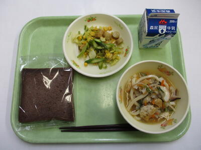 ココアパン、牛乳、五目うどん、アスパラソテー