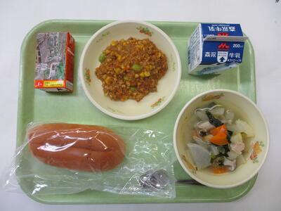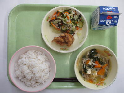 今日は「ふるさとくまさんデー」で人吉・球磨地域の郷土料理や特産物を使った給食です。人吉・球磨地域は山々に囲まれ、球磨川が中央を流れる自然豊かな地域で、いろいろな農作物が栽培されています。その中でもしいたけやきくらげの栽培は盛んで、特にきくらげは外国産が多い中、人吉球磨では日本一を目指して栽培されています。