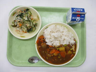 今日はえび・いか・わかめと海の幸を使った「シーフードサラダ」です。みなさんに人気のハヤシライスは、ビタミンやたんぱく質が不足しがちです。そのため、えび・いか・わかめでたんぱく質、野菜でビタミンを補えるサラダを添えました。よく噛んで食べてください。