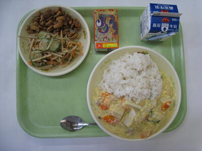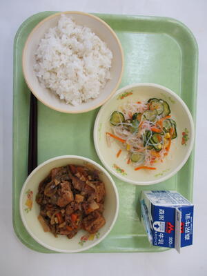大豆は「畑の肉」と呼ばれるほど栄養価の高い食べ物です。たんぱく質がたくさん含まれています。大豆は豆腐になったり、油揚げになったり、みそやしょうゆにも変身したりする、日本人の食事を支える食材です。今日は五目煮の中に大豆と油揚げ、醤油が使われています。給食だけでなく、家での食事でも、大豆が変身したものを探してみてくださいね。