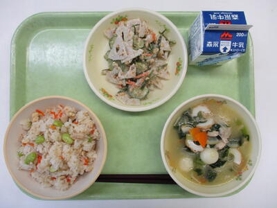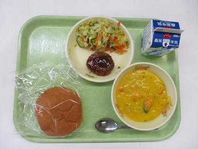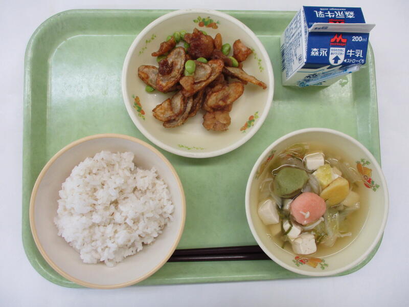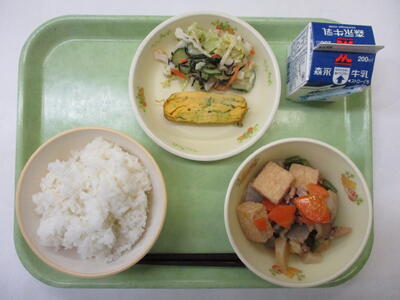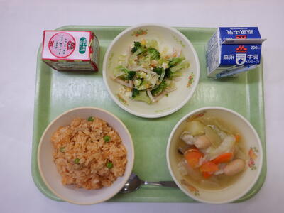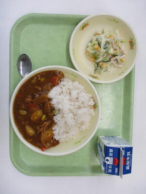 今日のサラダは緑の野菜をメインにしたサラダです。緑の野菜の中にたまごが入っていると黄色がきれいに映えますね。料理の美味しさや楽しさは味だけではなく、色や香り、食感や音などからも感じることができます。今日の給食も目で見て耳で聞いて楽しく食べてください。