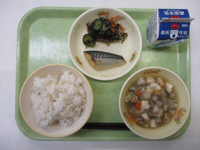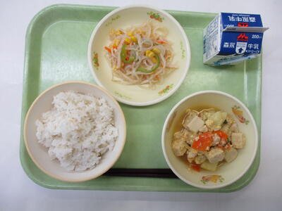 磯和えにはのりを使っています。みなさんはのりがどこで育つか知っていますか?のりは今日の献立名に「磯」と入っているように海で育ちます。おにぎりなどに巻く板状ののりは、海でとれたものを乾燥させて作っていきます。うまみ成分をたっぷり含んだ海の恵みをしっかり味わってください。