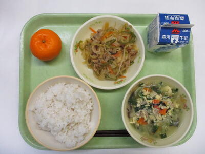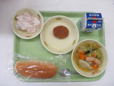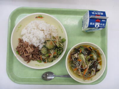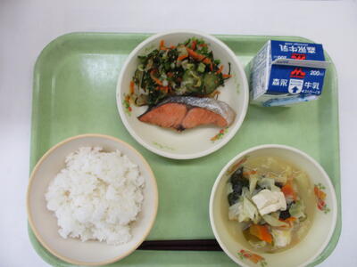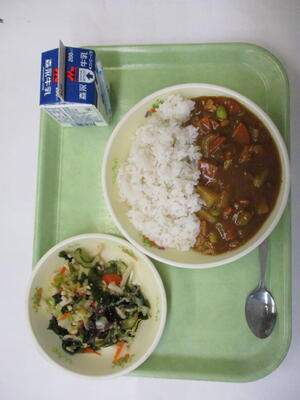 今日のサラダにはわかめ、茎わかめ、赤かえでのり、テングサという海藻からできた糸寒天が入っています。わかめ、昆布、ひじきといえばその海藻を思い浮かべることができると思いますが、赤かえでのりやテングサという海藻は知っていますか?今日の給食で探してみてください。