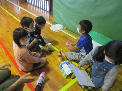 2年生は班ごとに、的あてや坂道、得点板などを作って、より動いて楽しくなる仕組み(おもちゃ)を用意しました。子ども達は、一生懸命にルールや遊び方を説明したり、モデルとなってやって見せたりと工夫をいっぱいして自分の思いを伝えていました。1年生も笑顔いっぱいにそれぞれの遊びを楽しみました。2年生も満足満足の笑顔でした。