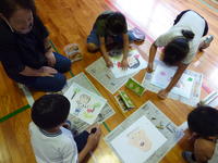 舞台劇の内容を説明していただいた後、今回の劇に関連した「自分の大切な人」を絵に描きました。できあがった絵は、当日、会場に掲示し、舞台を盛り上げる予定です。