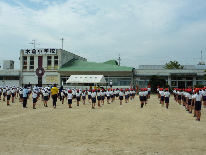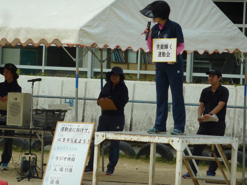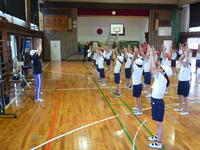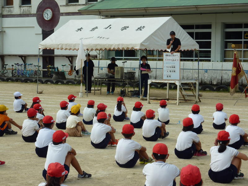 はじめに体育主任の先生や校長先生から運動会へ向けた心構えについて話があり、その後、基本の姿勢やラジオ体操、入場行進の練習をしました。