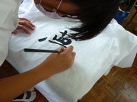 5・6年生では今日(10月19日)、運動会当日に使う法被作りをしました。各家庭から持ってきた白いワイシャツに、自分が好きな一文字をインクで描きました。