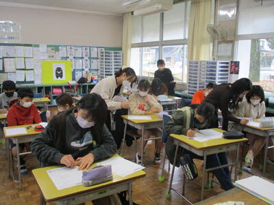 授業内容は2学期の復習です。分数のわり算、文字を用いた式の表し方、割合など様々な問題に6年生が取り組み、音大の学生先生方に○を付けてもらいました。学校外の方に○を付けてもらう6年生はうれしそうでした。中には、間違った問題を学習ボランティアの学生の方々に優しく教えてもらう姿もありました。