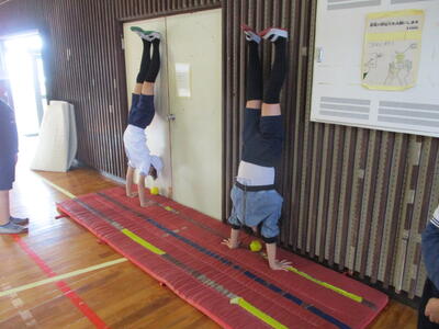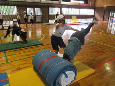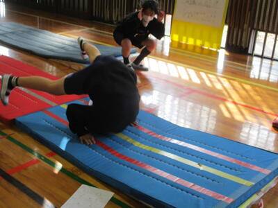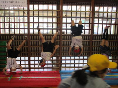 「前転、後転、開脚前転、開脚後転」「側方倒立回転」「壁倒立、頭倒立」「補助倒立ブリッジ」などの様々な技の工夫された場が用意されています。子どもたちはグループでそれぞれの場へ行き、学習した技のこつ「スキルポイント」を活用して、技に挑戦していました。ペアの友達からアドバイスを受けたり、励まされたり、一緒に喜び合ったりして楽しみながら技を獲得したり、より上手にできるようになったりしていました。