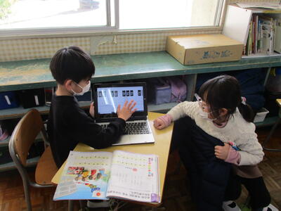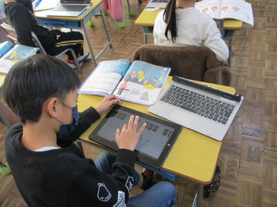 一人一人のタブレットに鍵盤が現れ、鍵盤をタッチすると音が出ます。子ども達も好奇心一杯にタブレットの鍵盤を使って弾いていきます。教室のあちらこちらから「きらきらぼし」の素敵なメロディーが流れてきます。タブレットの使い方も子ども達同士で教え合っていて、手慣れた様子です。コロナ対策をしっかりしながら、ICTも活用して子ども達の教育活動をできるだけ止めないようにしていきます。