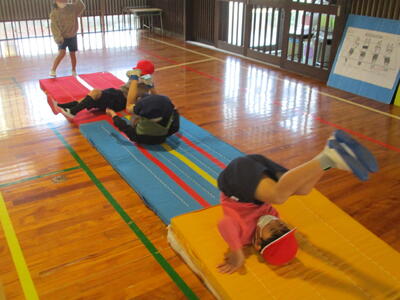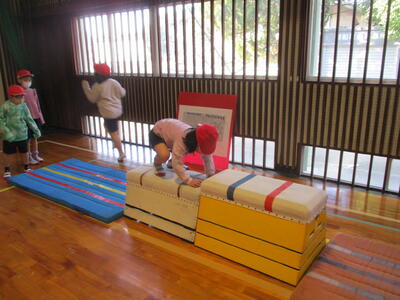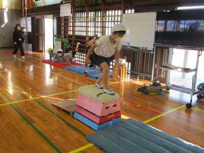 1年生の体育はマットや跳び箱、固定施設などを使った運動遊びです。