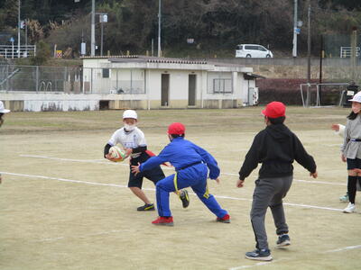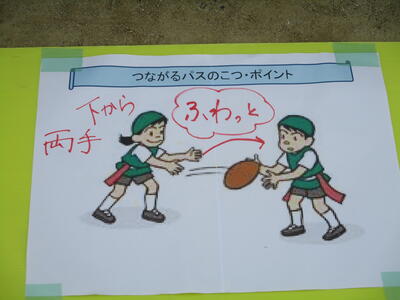 子どもたちは、ボールを持ったら、一所懸命に前に走り、タッチラインを目指します。タグを取られると、後ろの見方のパスをし、さらに前へ前へとトライをめざしていました。