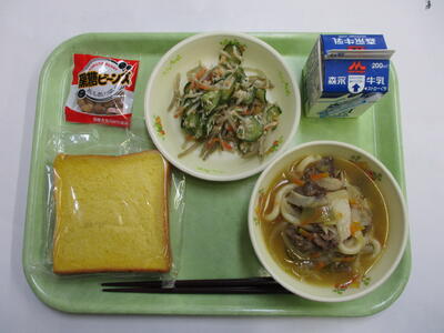 米粉入り人参パン、牛乳、肉うどん、ごぼうサラダ、黒糖ビーンズ
