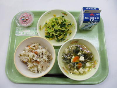 寒い日がまだまだ続いています。この季節、冷たいものを飲むのは努力がいりますが、牛乳には体の骨や歯を作るのに欠かせないカルシウムや血や肉になるたんぱく質、ビタミンなどが多く含まれています。成長期の皆さんには欠かせない食品です。一口ずつ口の中で温めるように、ゆっくり飲んでみてください。パンやおかずと交互に飲むとおいしく飲めますよ。