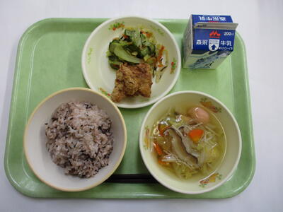 赤飯、牛乳、三色つみれ汁、鶏の唐揚げ、ひじきあえ