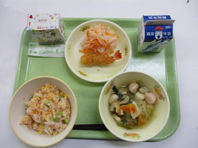 今日は御船小4年生が外国語の授業で紹介してくれた「我が家のオリジナルカレー」と「オリジナルフルーツポンチ」です。カレーは4年2組の古田なおやさんのおうちのカレーを再現しました。隠し味にコーヒーとしょうゆが入っていて玉ねぎとコーンがよく合うカレーです。それから、「フルーツポンチ」は4年1組の新原ゆなさんが考えた、「ジューシーで色あざやか、心がほっとするみんな大好きで栄養満点フルーツポンチ」です。また、お米は御船小の4年生が田植えをし、収穫したお米です。御船小4年生のスペシャルメニューを味わって食べてください。