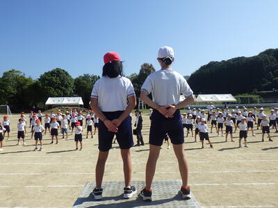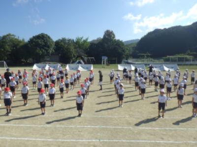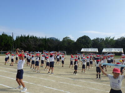 運動会に向けた全体練習4回目の様子です。目標は「入退場の動きをそろえる!」。この日は、紺碧の空の下、子どもたちは一糸乱れぬ動きをしていました。