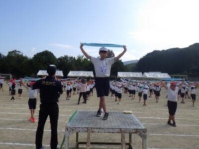 運動会に向けた全体練習が始まりました。この日は、晴天のため気温が30℃を超える中で、熱中症対策で水分補給と休憩を取りながらの練習となりました。