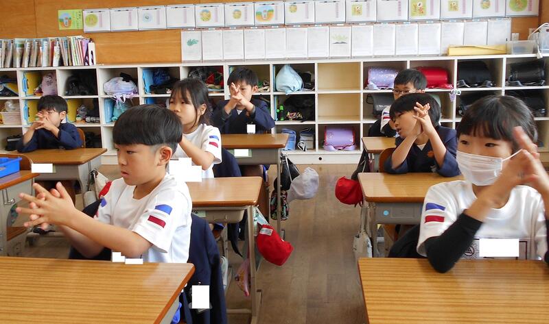 身体計測の残りの時間を使って手洗い指導を行いました。