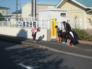 今日のあいさつ運動は、鼠蔵町と平和町の子どもたち。あいさつは、する方もされる方も気持ちよくなります。不思議な力がありますよね!