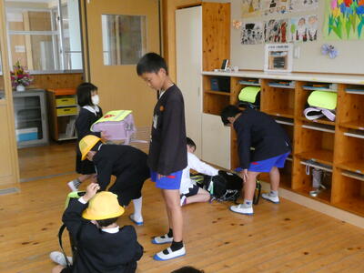 朝からの準備の手伝いや、準備後の過ごし方を教えるため、6年生は1年生の教室に通っています。