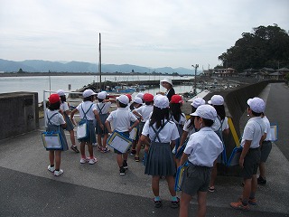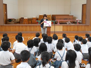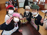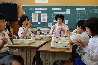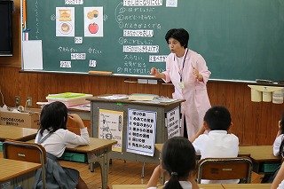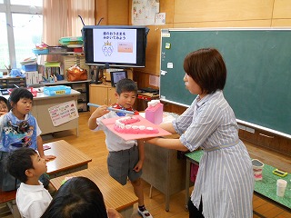 顔に手をあて、あごの動きを確かめます。しっかりかむことの大切さを学びました。