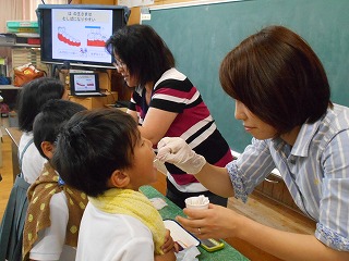 歯の王さまといわれる「第一大臼歯(おく歯)」がしっかりみがけているか赤い液(染め出し)をつかってチェックをします。
