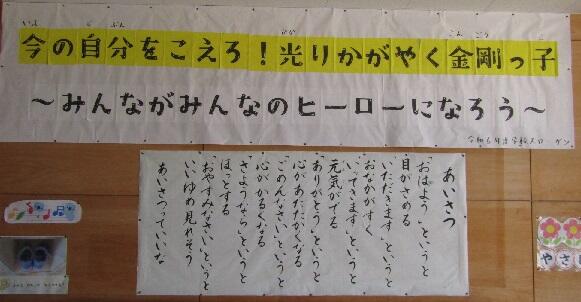 児童昇降口の壁に、今年の金剛小学校のスローガンを掲示しています。