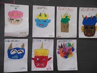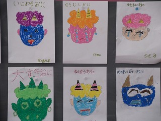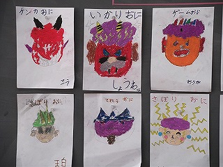 2年生では、「自分の中のおにを追い出そう!」をテーマにおにの絵をかき、豆まきをしました。自分の中の追い出したいおにということで、「ねぼうおに」「けんかおに」いじわるおに」などが出てきました。おにの絵もそれぞれに工夫してあり、傑作が出そろいました。