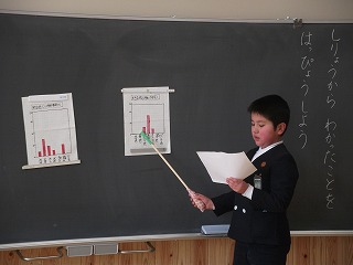 3年生は、国語で「資料から分かること」の学習をしてまとめたことを発表しました。算数で学習したグラフも使い、調べて分かったことを自分なりに比較して、気づきを言ってくれました。