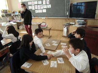 どうぶつの名前のかるたゲームをしました。catやdogなど、耳慣れた言葉は言えるのですが、giraffe(キリン)、zebra(シマウマ)、elephant(ゾウ)などは、おぼえるのに苦戦していました。