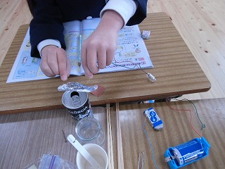 「空き缶は、削ったら明かりが付くよ!」「金属は電気を通すから、明かりが付くんだね」
