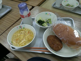 今日のメニューは、ミルクパン、うまかコロッケ、冬野菜サラダ、トマトと卵のスープ、牛乳でした。