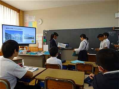 山田小や万江小の学校紹介を真剣に聞いています。