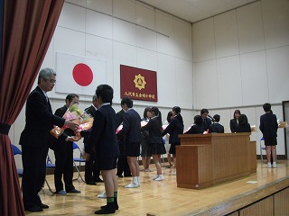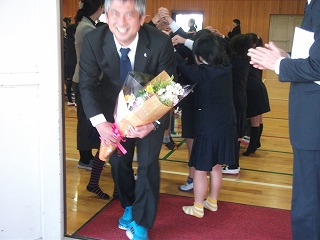 お礼の言葉を合わせて、感謝の気持ちを花束にこめて贈りました。これも代表の児童が一人ずつ一言交わして贈呈を行い、感動の瞬間でした。