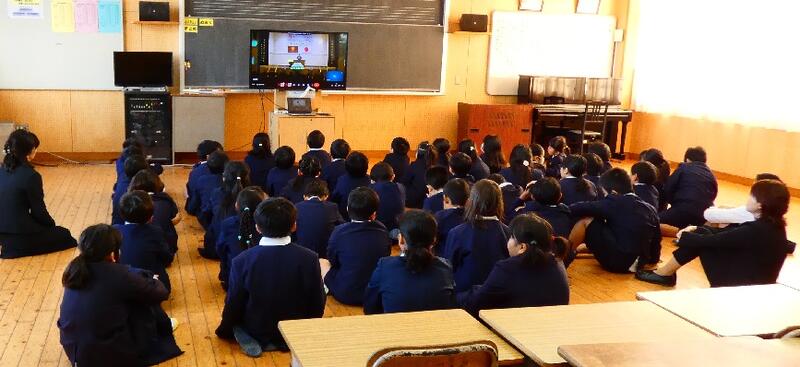 第一部、分校の子達は教室に分かれてオンラインで参加です。