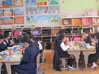 6年生と一緒に給食を食べるなんて、はずかしいやら