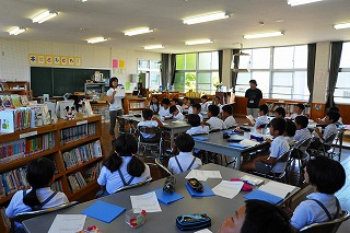 KKT「おとどけ絵本」から、八谷アナウンサー、三宅アナウンサーが来校され、1・2・3年生に読み聞かせをしてくださいました。エプロン姿のお二人に、どんなお話が始まるのだろうと、わくわくした様子の子どもたち。大型絵本「へんしんトンネル」や「十二支のはなし」などのお話を聞きました。1時間、たっぷりと本の世界を楽しむことができました。早口言葉にも、挑戦しました。気分はすでに、アナウンサー?         (文責M・K)