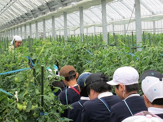 今日は、トマトを栽培されている鶴田さんのトマトのビニールハウスの見学に行きました。