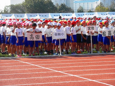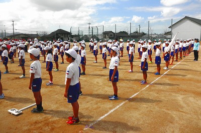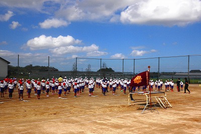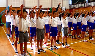 集会では運動会の歌を歌い、運動会の気分を高めています。