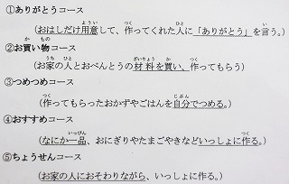 「おすすめコース」や「ちょうせんコース」では、おにぎりやサンドイッチ、玉子焼きやウインナーなどを、おうちの方と一緒に作ったようです。
