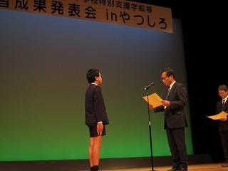 11月20日(金)、鏡文化センターで行われた小・中学校特別支援学級等学習成果発表会inやつしろに、かがやき学級、わくわく学級、ひまわり学級の子ども達が参加しました。