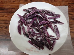 作り方はまず、おいもを洗って、皮をむきます。その後スティック状に切ります。そして片栗粉をまぶして、油であげてできあがりです。