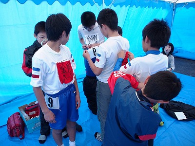 お互いにゼッケンを付け合い