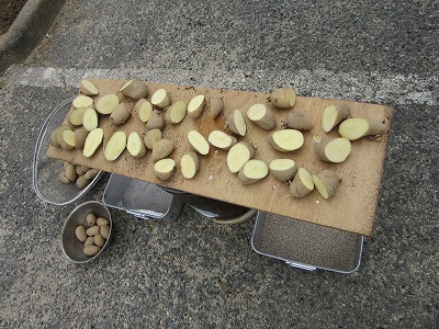 さて、植え方を教わり、早速自分たちの番です。切った部分に灰を付けて、くぼみの中に置いていきます。一人4つの種芋を植えて、「おおきくな~れ~。」と心を込めて土をかぶせました。