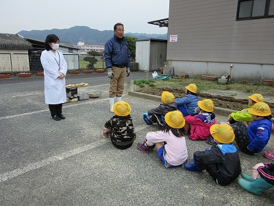 わくわくして給食センターへ。すると種芋を見つけて、「???」「なんでじゃがいもを植えるの?」と不思議そうな子どもたち。センター長の先生から植え方のお話を聞いて、種芋からじゃがいもが生長していくことを知りました。