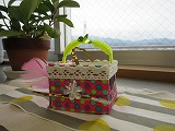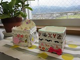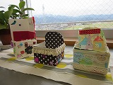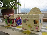 牛乳パックに布を貼り付けて、飾りを付けました。毎時間少しずつ作業を進めて、今日完成した人の作品を紹介します。