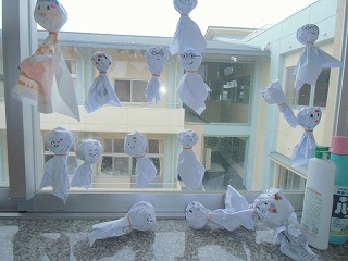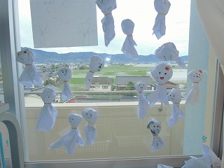 今週に入り、5年生教室前に飾ってある、たくさんの「てるてる坊主」。