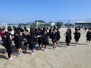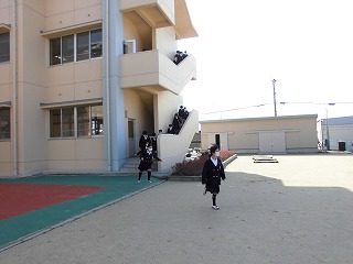 家庭科室からの火災という想定で、児童は家庭科室を避けて運動場に避難をしました。