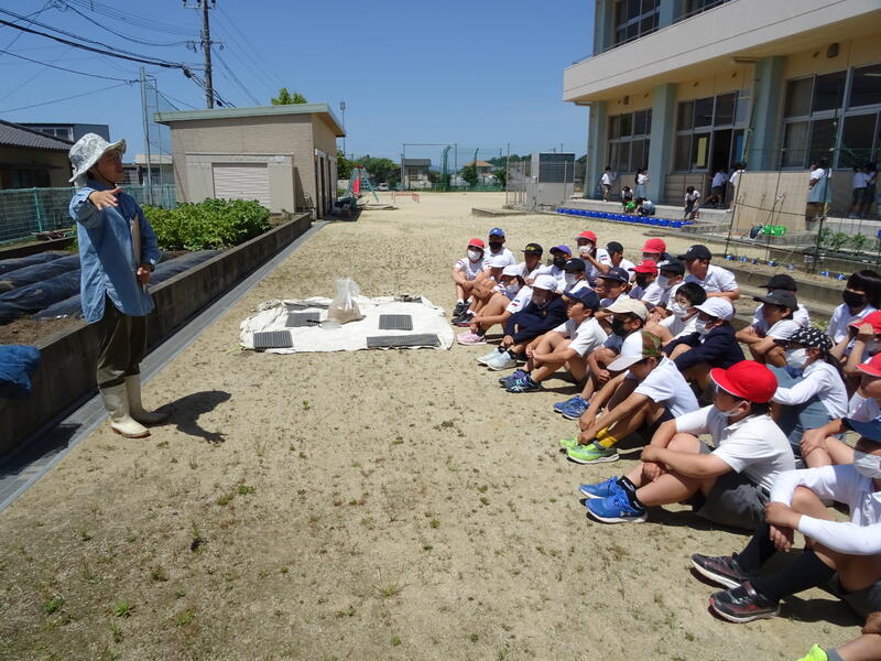 5月24日(水)に地域の塚田さんから土づくりについて教えていただきました。写真はその時のようすです。本年度はバケツ稲の取組を行います。5月26日(金)には、学校の近くの田んぼに出かけ、田起こしについて学習しました。地域の方と交流を深めながら学習を進めていきます。